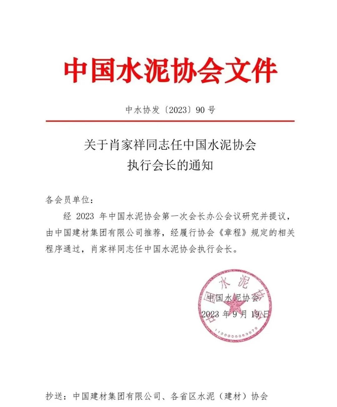 2023年9月19日,出任中國水泥協(xié)會執(zhí)行會長