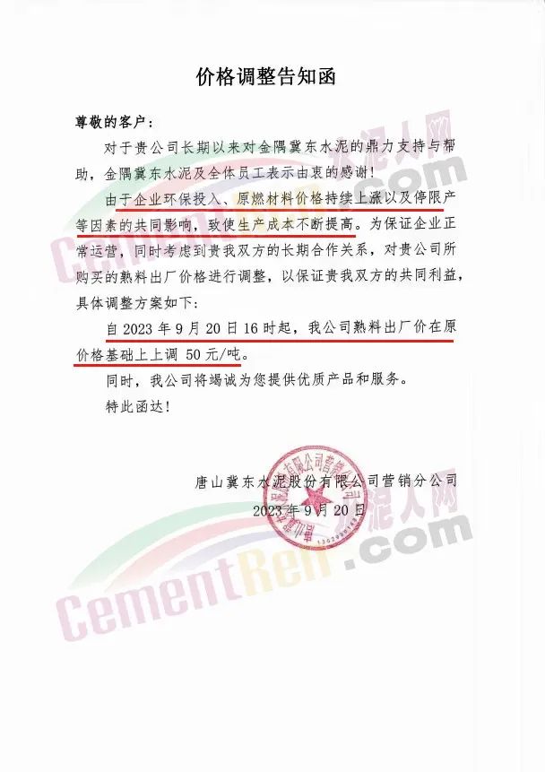 唐山冀東水泥股份有限公司營(yíng)銷分公司通知,由于企業(yè)環(huán)保投入、原燃材料價(jià)格持續(xù)上漲以及停限產(chǎn)等因素的共同影響,致使生產(chǎn)成本不斷提高。為保證企業(yè)正常運(yùn)營(yíng),自2023年9月20日16時(shí)起,熟料出廠價(jià)在原價(jià)格基礎(chǔ)上上調(diào)50元/噸。