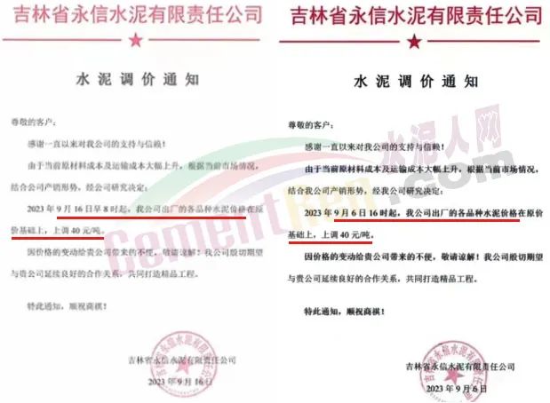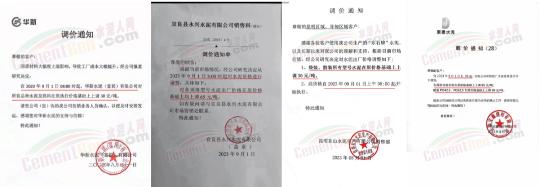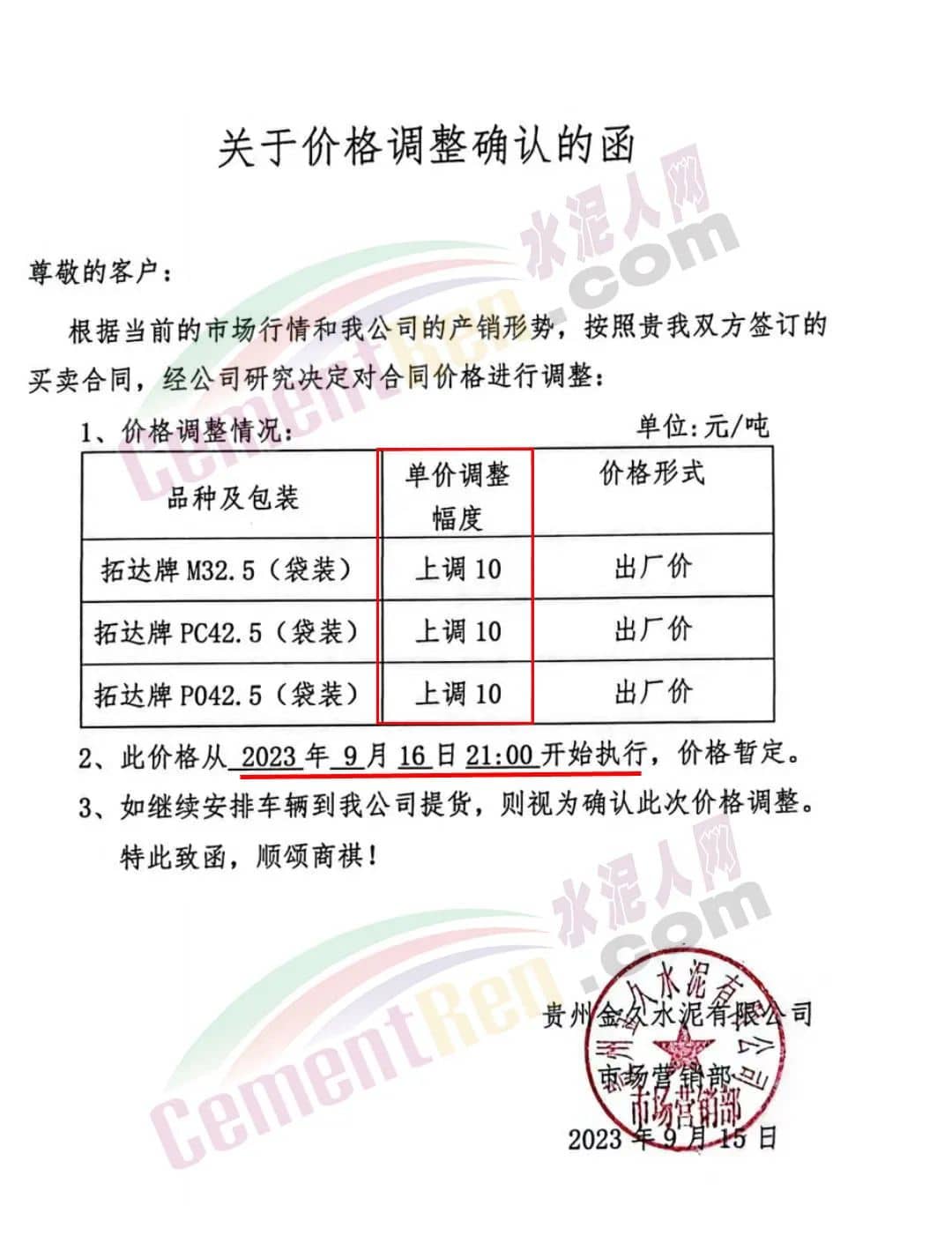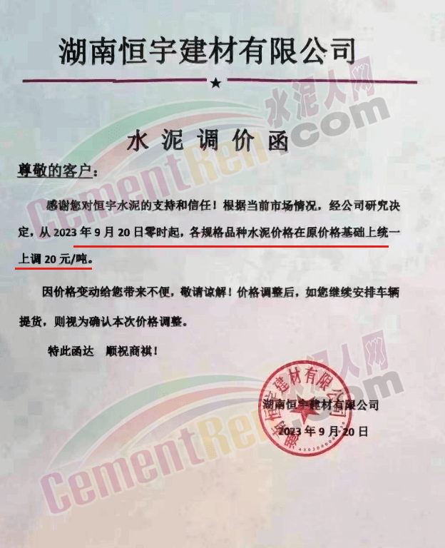 華新水泥(宜昌)公司、葛洲壩松滋水泥通知,因公司生產(chǎn)成本持續(xù)上漲,市場(chǎng)行情發(fā)生變化,經(jīng)公司研究決定于2023年9月20日17:00起,所有品種水泥價(jià)格上調(diào)20元/噸。