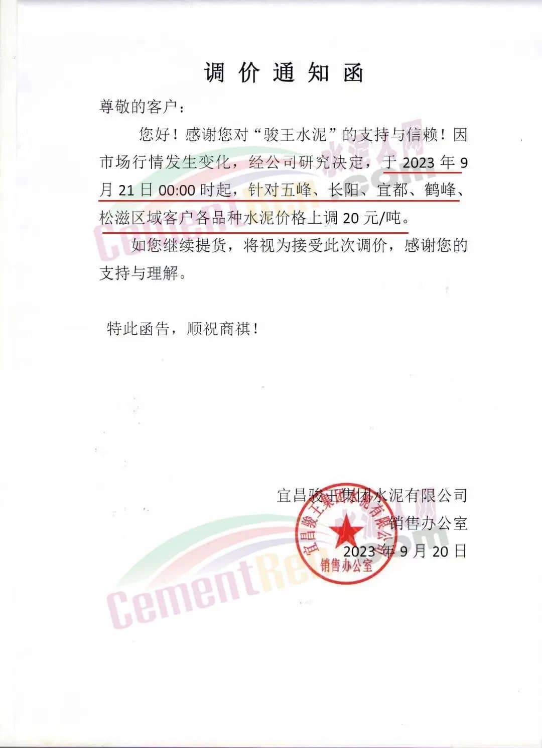 宜昌駿王水泥有限公司通知,因市場(chǎng)行情發(fā)生變化,經(jīng)公司研究決定,于2023年9月21日00:00時(shí)起,針對(duì)五峰、長(zhǎng)陽、宜都、鶴峰、松滋區(qū)域客戶各品種水泥價(jià)格上調(diào)20元/噸。