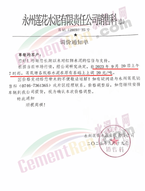 祁陽海螺水泥通知,根據(jù)當(dāng)前市場(chǎng)形勢(shì)及公司產(chǎn)銷情況,經(jīng)研究決定自2023年9月20日8:00起對(duì)所有區(qū)域各品種水泥價(jià)格上調(diào)20元/噸。