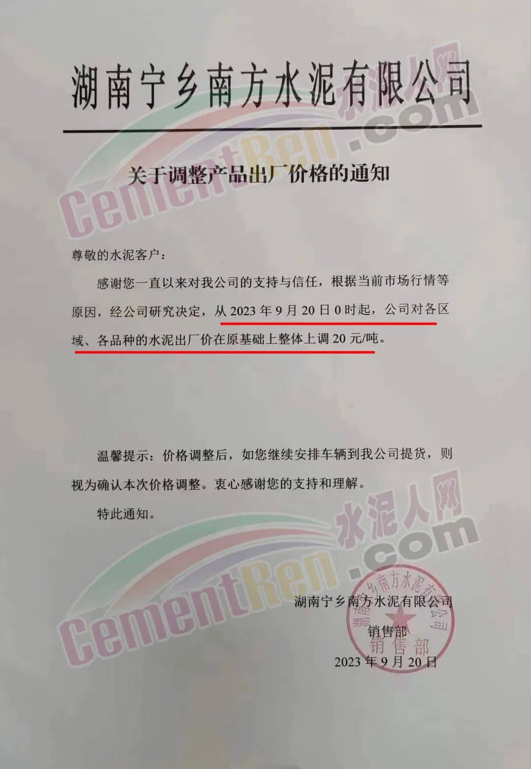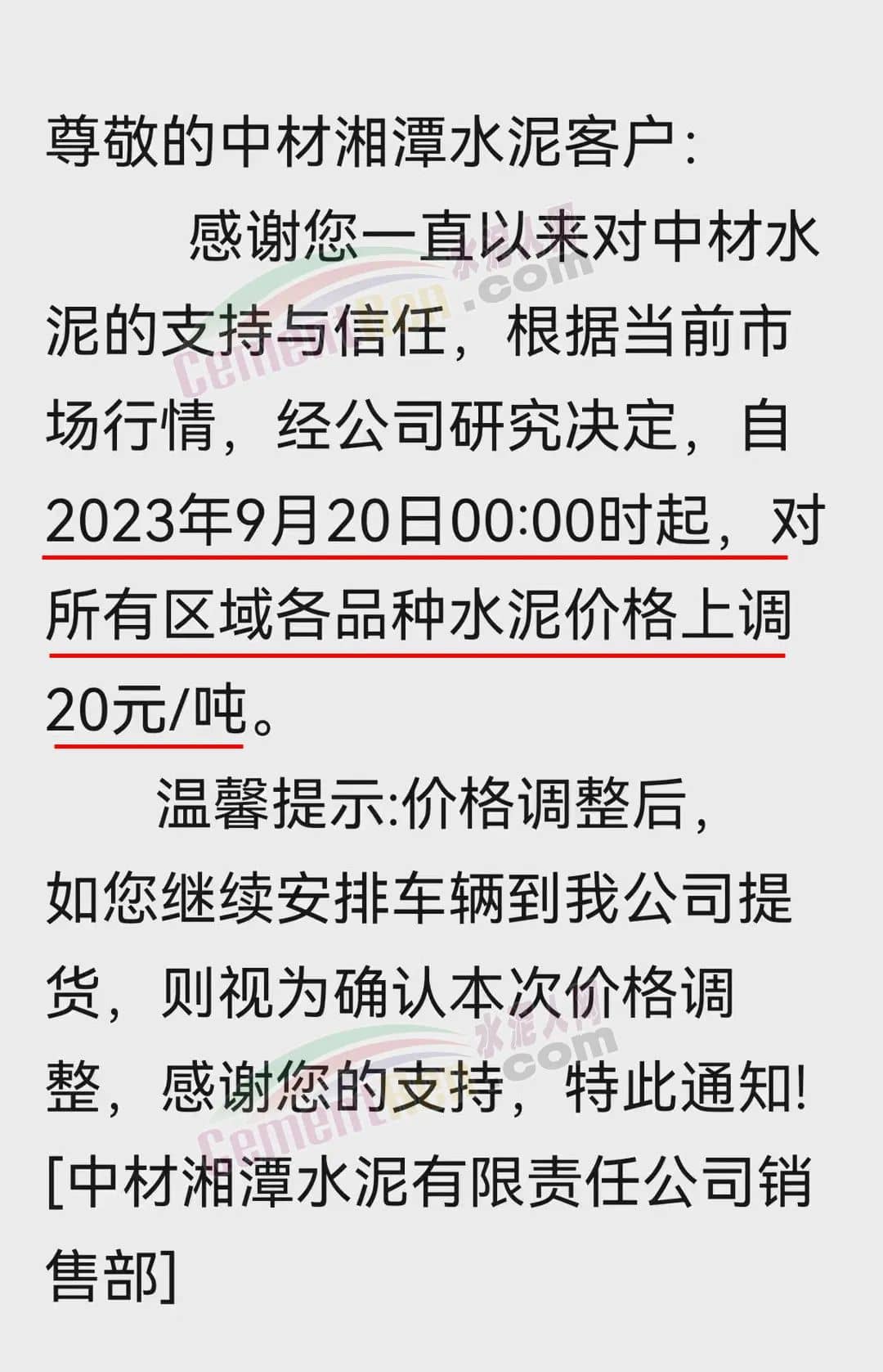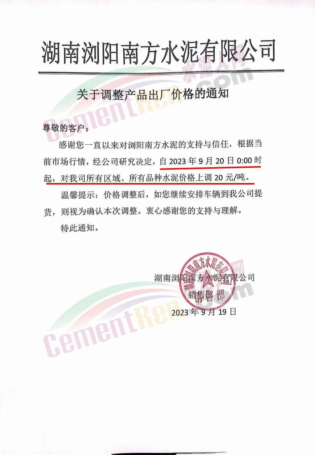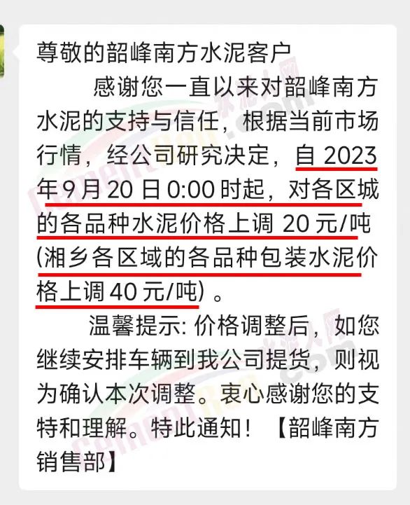 中南水泥旗下耒陽南方、寧鄉(xiāng)南方、瀏陽南方、桃江南方、坪塘南方、韶峰南方、中材湘潭水泥等多家企業(yè)通知,根據(jù)當(dāng)前市場(chǎng)行情,經(jīng)公司研究決定,從2023年9月20日0時(shí)起,對(duì)各區(qū)域、各品種的水泥出廠價(jià)在原基礎(chǔ)上上調(diào)20~40元/噸。