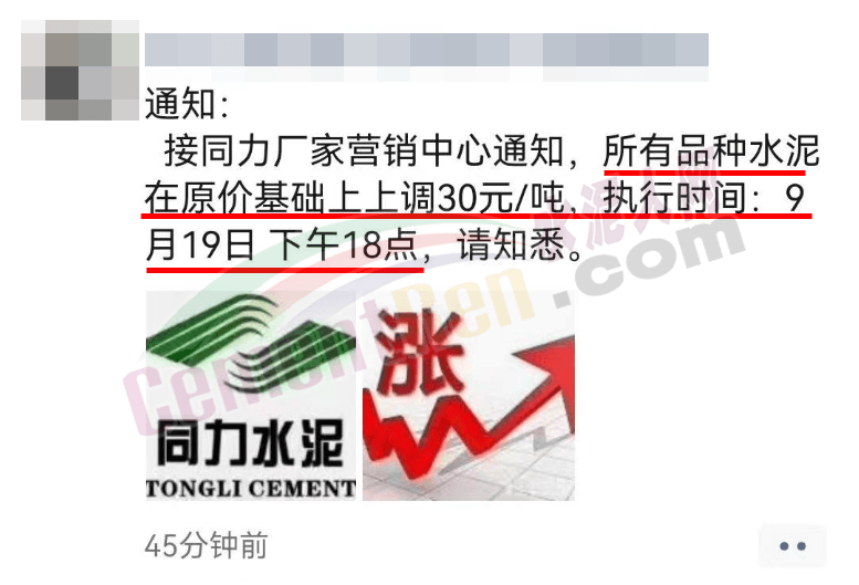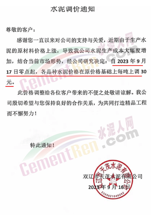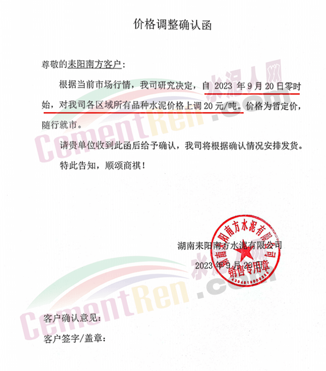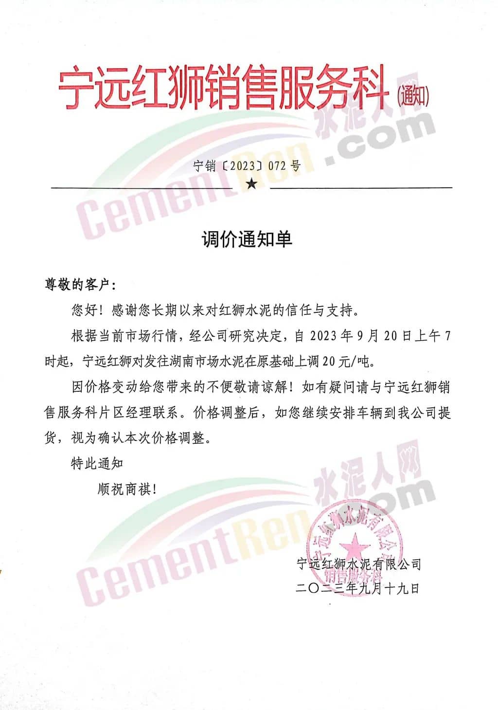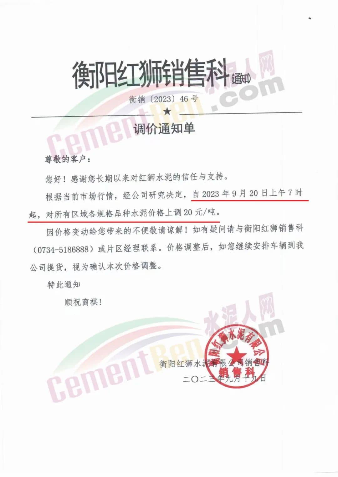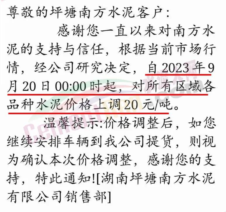 中南水泥旗下耒陽南方、寧鄉(xiāng)南方、瀏陽南方、桃江南方、坪塘南方、韶峰南方、中材湘潭水泥等多家企業(yè)通知,根據(jù)當(dāng)前市場(chǎng)行情,經(jīng)公司研究決定,從2023年9月20日0時(shí)起,對(duì)各區(qū)域、各品種的水泥出廠價(jià)在原基礎(chǔ)上上調(diào)20~40元/噸。