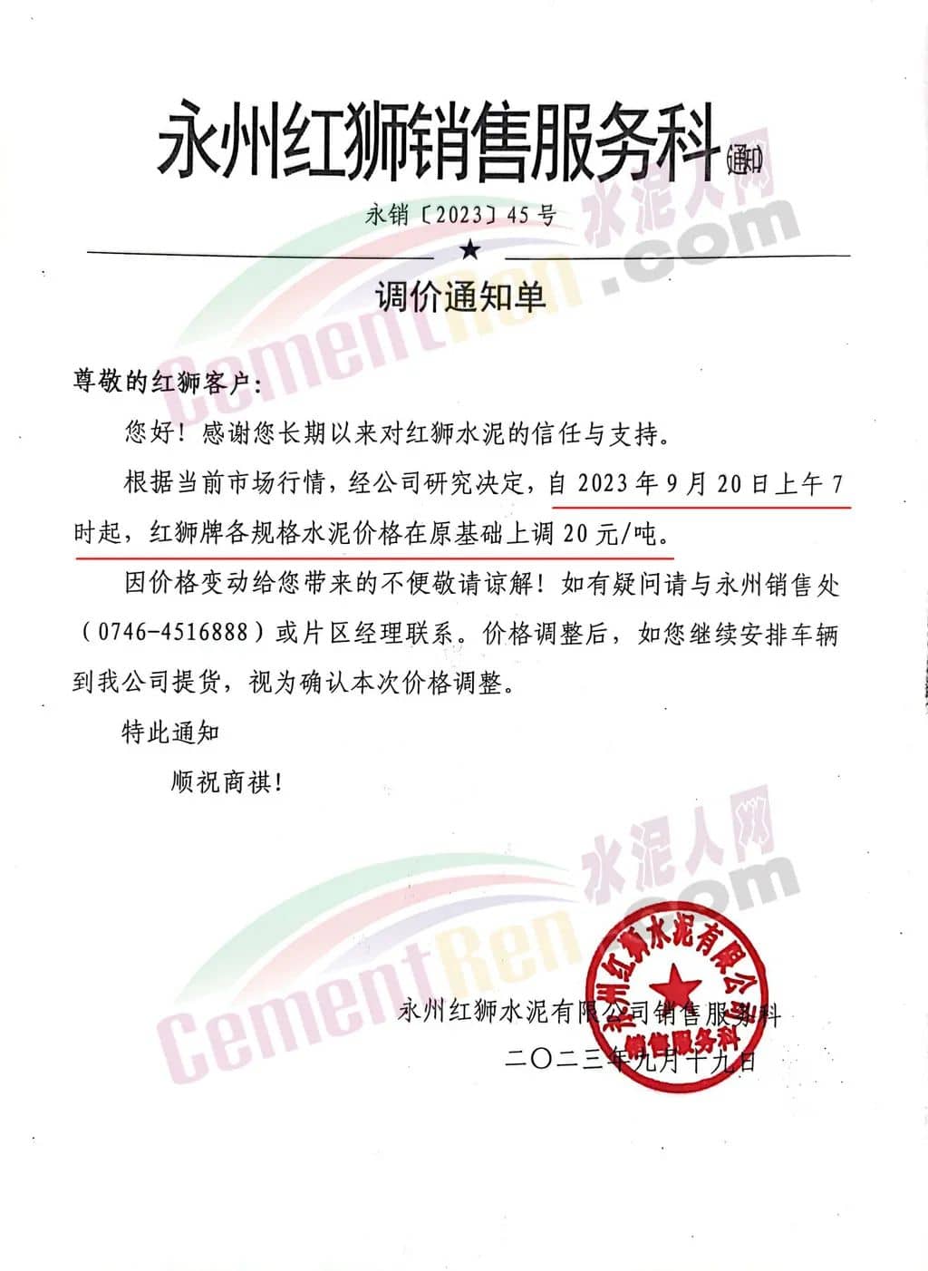 紅獅水泥旗下永州紅獅、寧遠(yuǎn)紅獅、衡陽紅獅、永州蓮花水泥、康達(dá)(湖南)水泥等多家企業(yè)通知,根據(jù)當(dāng)前市場(chǎng)行情,經(jīng)公司研究決定,自2023年9月20日上午7時(shí)起各規(guī)格水泥價(jià)格在原基礎(chǔ)上上調(diào)20元/噸。