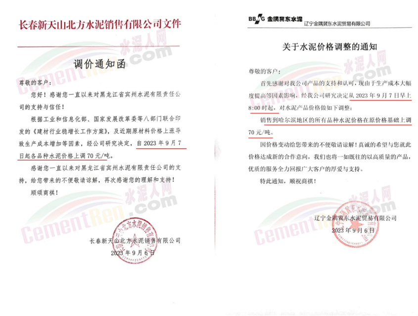 9月8日,雙鴨山新時(shí)代水泥、長(zhǎng)春新天山北方水泥龍東營(yíng)銷中心伊春銷售部、三江銷售部分別通知,各品種水泥價(jià)格上調(diào)50元/噸。