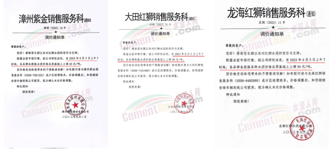 其中,紅獅水泥旗下漳州紫金水泥、龍海紅獅、大田紅獅銷售服務(wù)科通知,各品牌各規(guī)格品種水泥價(jià)格在原基礎(chǔ)上上調(diào)30元/噸。