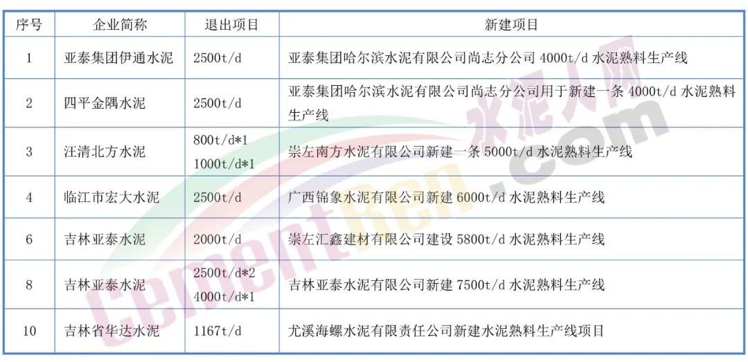 另據(jù)了解,今年4月中旬,吉林省工信廳公布水泥熟料生產(chǎn)線清單顯示,9條2500t/d及以下水泥熟料生產(chǎn)線已通過產(chǎn)能置換出讓,退出項目將隨著新建線投產(chǎn)逐步退出。