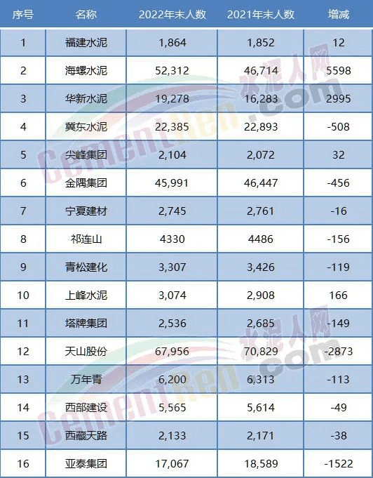 據(jù)上市企業(yè)公開數(shù)據(jù),從2019~2022年金隅集團、冀東水泥、亞泰集團員工都有千人以上的減員,萬年青、祁連山、塔牌水泥均有百人以上的減員。2021~2022年金隅集團、冀東水泥、萬年青、祁連山、塔牌集團、青松建化等均有百人以上的減員,冀東水泥減員達500多人。然而,從水泥行業(yè)未來發(fā)展來看,這才是剛剛開始。