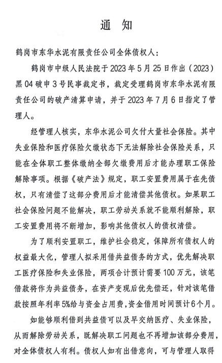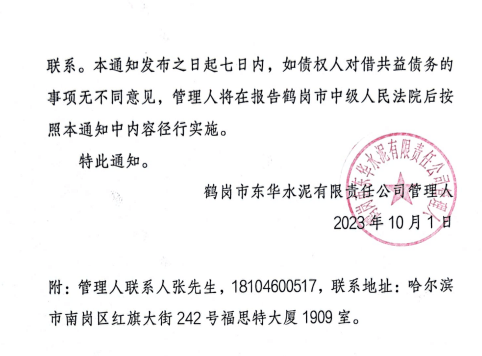 鶴崗市中級(jí)人民法院已于今年5月裁定受理鶴崗市東華水泥有限責(zé)任公司的破產(chǎn)清算申請(qǐng),并于2023年7月6日指定了管理人。