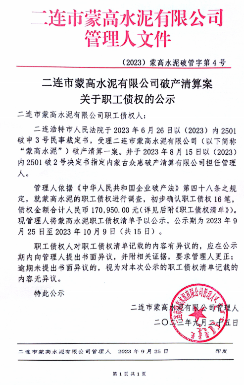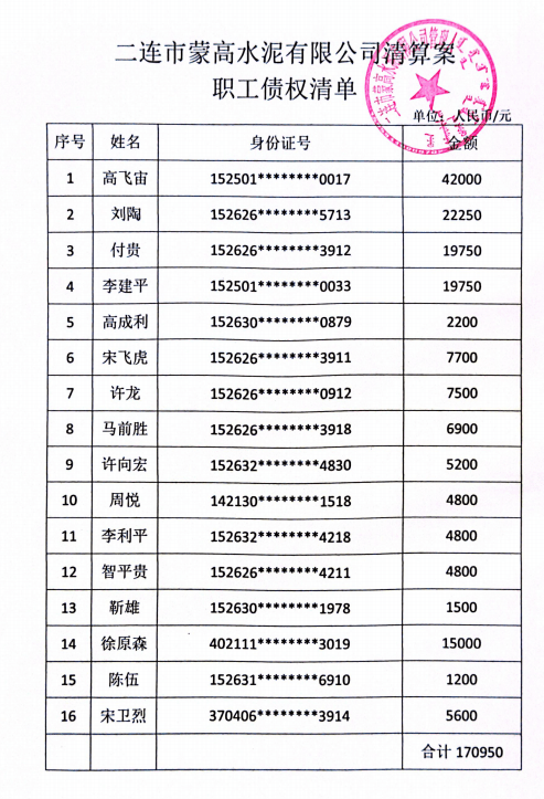 二連市蒙高水泥有限公司破產(chǎn),管理人初步確認(rèn)職工債權(quán)16筆債權(quán)金額合計(jì)人民幣170,950.00元。