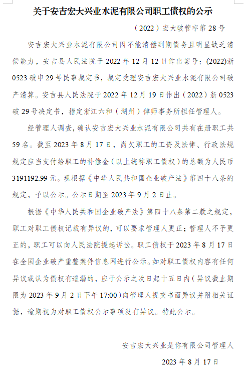 8月17日,安吉宏大興業(yè)水泥有限公司管理人發(fā)公示消息稱,經(jīng)調(diào)查確認(rèn)安吉宏大興業(yè)水泥有限公司共有在冊(cè)職工共59名。截至2023年8月17日,尚欠職工的工資及法律、行政法規(guī)規(guī)定應(yīng)當(dāng)支付給職工的補(bǔ)償金(以上統(tǒng)稱職工債權(quán))的總額為人民幣3191192.99元。
