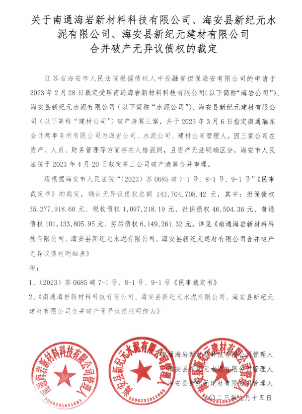 江蘇省海安市人民法院根據(jù)債權(quán)人中投融資擔(dān)保海安有限公司的申請(qǐng),于2023年2月28日裁定受理南通海巖新材料科技有限公司、海安縣新紀(jì)元水泥有限公司、海安縣新紀(jì)元建材有限公司破產(chǎn)清算三案,并于2023年3月6日指定南通瑞東會(huì)計(jì)師事務(wù)所有限公司為海巖公司、新紀(jì)元水泥公司、建材公司管理人。因三家公司在資產(chǎn)、人員、財(cái)務(wù)管理等方面存在人格混同,且資產(chǎn)無法明確區(qū)分,海安市人民法院于2023年4月20日裁定將三公司破產(chǎn)清算合并審理。