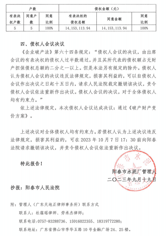陽(yáng)春市水泥廠共5戶債權(quán)人參加,享有表決權(quán)的債權(quán)金額共計(jì)人民幣14,153,113.94元。經(jīng)表決,2戶債權(quán)人提交表決票,均表決不同意,但其至今均未向管理人墊付追收16筆對(duì)外應(yīng)收債權(quán)的訴訟費(fèi)。依表決規(guī)則,應(yīng)視為其同意。剩余3戶債權(quán)人未提交表決票,依表決規(guī)則,應(yīng)視為其同意。