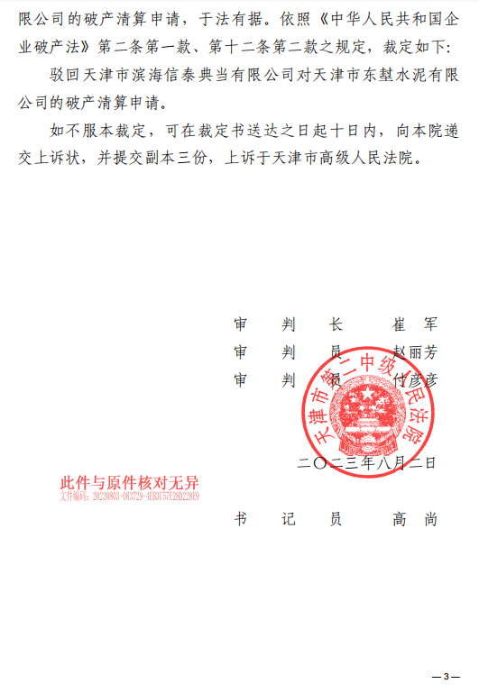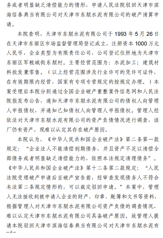 2023年7月21日,管理人向天津市第二中級(jí)人民法院提交申請(qǐng)稱,天津市東堼水泥有限公司相關(guān)人員下落不明,管理人未能接收到天津市東堼水泥有限公司的財(cái)產(chǎn)、印章、賬簿和文書等資料,經(jīng)管理人依法對(duì)天津市東堼水泥有限公司的資產(chǎn)負(fù)債情況進(jìn)行調(diào)查,該廠仍有資產(chǎn),現(xiàn)難以認(rèn)定其存在破產(chǎn)原因。法院于8月2日裁定駁回天津市濱海信泰典當(dāng)有限公司對(duì)天津市東堼水泥有限公司的破產(chǎn)清算申請(qǐng)。