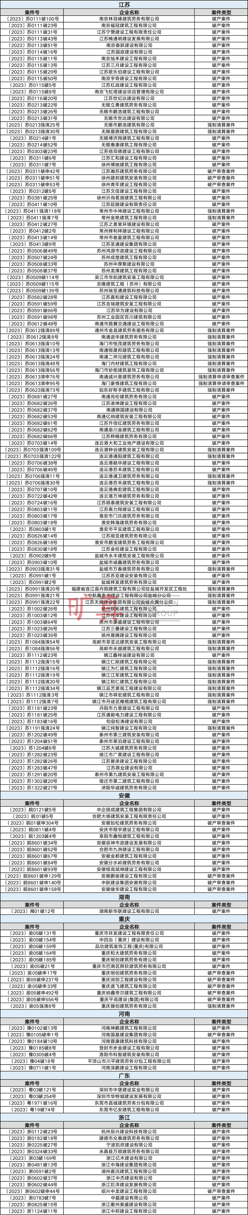 2023年1月全國(guó)建筑企業(yè)破產(chǎn)重整案件匯總