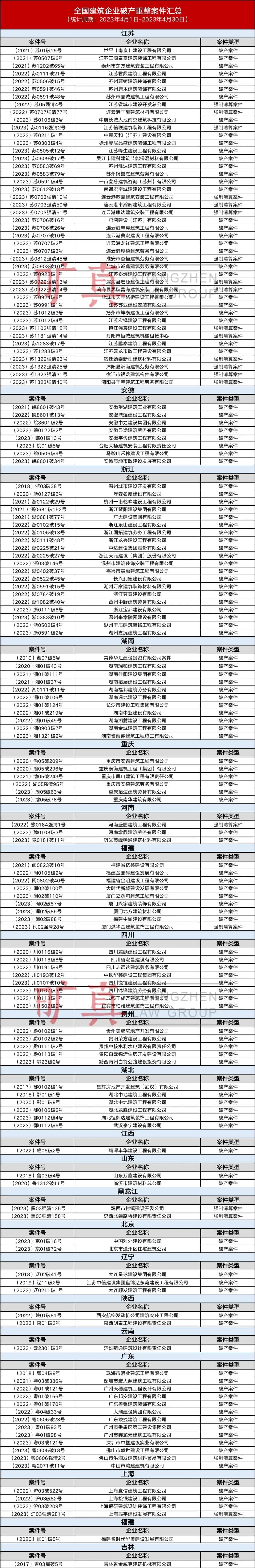 2023年4月全國(guó)建筑企業(yè)破產(chǎn)重整案件匯總