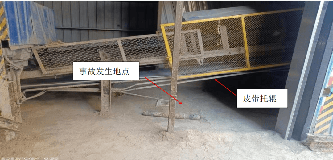 經(jīng)現(xiàn)場勘查、問詢,查閱資料,初步分析,該工人清理積料時進入運轉(zhuǎn)的皮帶機下部,由于該部位高度較低(1.05米),周圍較為狹窄,在用手持刮板工具清理積料時,右臂肘部被卷入下部皮帶托輥與皮帶之間,進而帶動身體回轉(zhuǎn),造成頭部被卷入托輥與皮帶之間,導致事故發(fā)生。