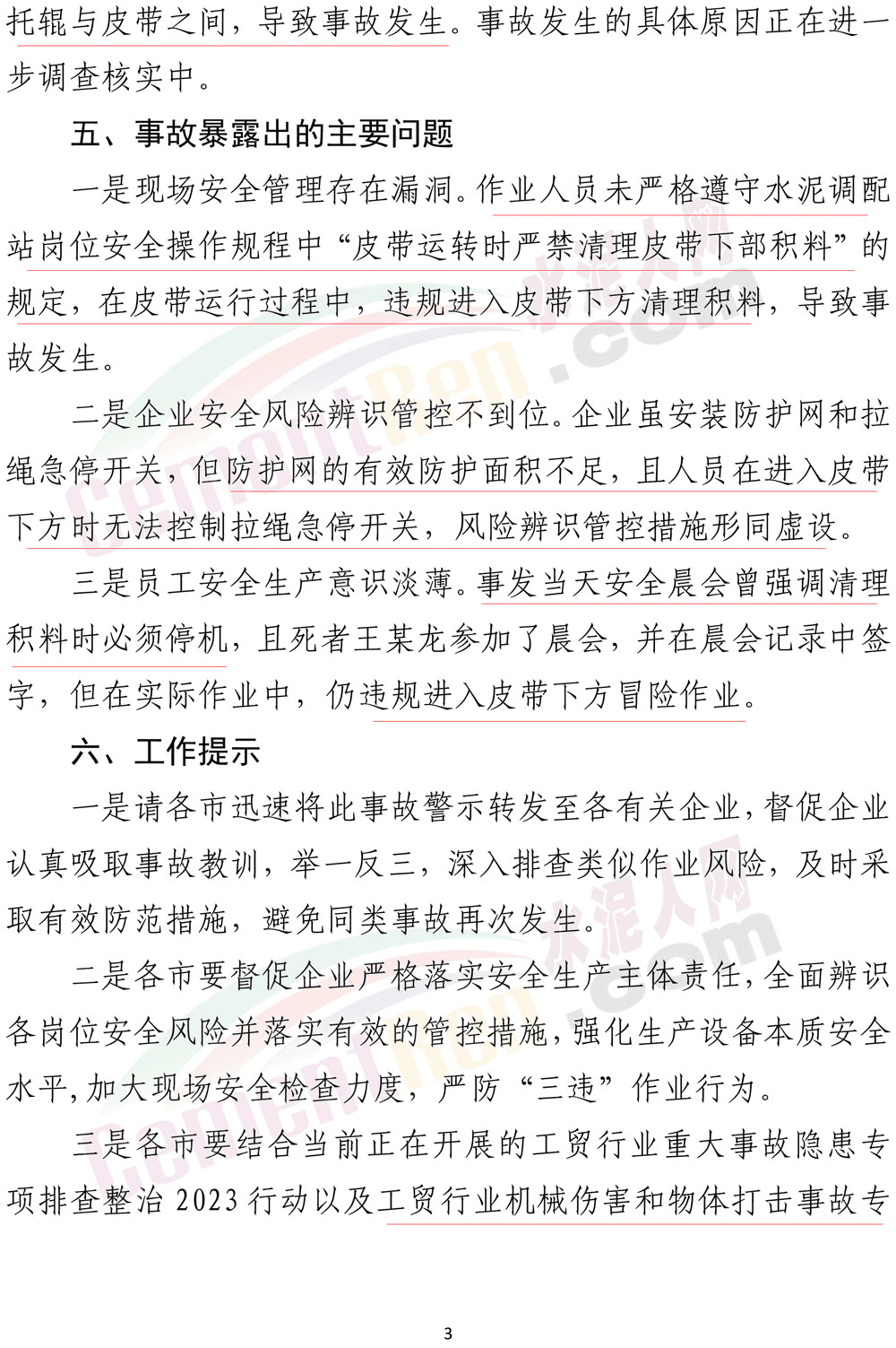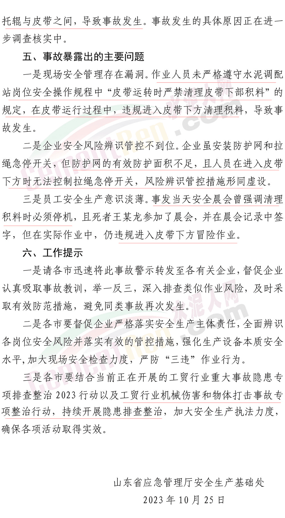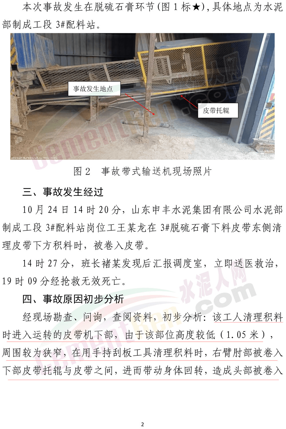 2023年10月25日,山東省應急管理廳發(fā)布了一則《事故警示》。其中提到:10月24日14時20分,山東申豐水泥集團有限公司水泥部制成工段3#配料站崗位工王某龍,在3#脫硫石膏下料皮帶東側(cè)清理皮帶下方積料時,被卷入皮帶。14時27分,班長褚某發(fā)現(xiàn)后匯報調(diào)度室,立即送醫(yī)救治,19時9分經(jīng)搶救無效死亡。