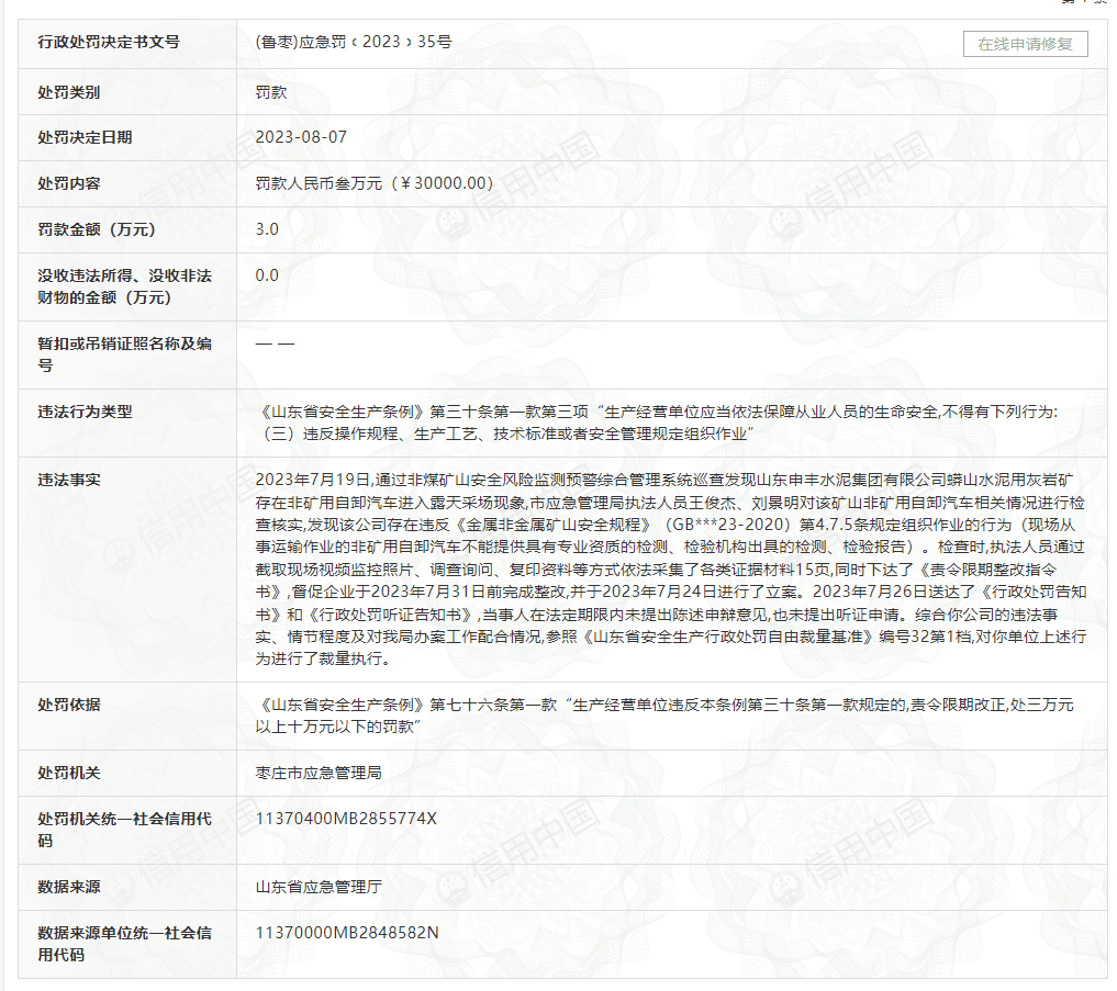 今年8月7日,棗莊市應急管理局依據(jù)《山東省安全生產(chǎn)條例》曾對申豐水泥公司處以3萬元罰款。處罰原因為:企業(yè)水泥用灰?guī)r礦存在非礦用自卸汽車進入露天采場現(xiàn)象。