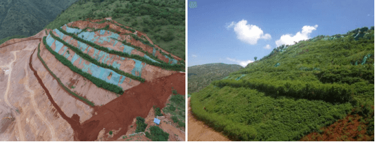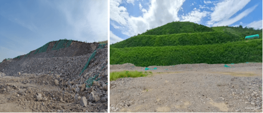 項目位于云南元江縣永發(fā)水泥有限公司,邊坡坡度約45~65°,局部坡段坡度超過65°的高陡邊坡,坡積物、強風化層剝離和開挖形成的邊坡,坡面局部存松散滑動層,恢復(fù)難度較大。通過采用肥力錨點雙網(wǎng)工藝,結(jié)合當?shù)氐泥l(xiāng)土植物組配,實現(xiàn)了90%以上的覆蓋度以及后期免維護。