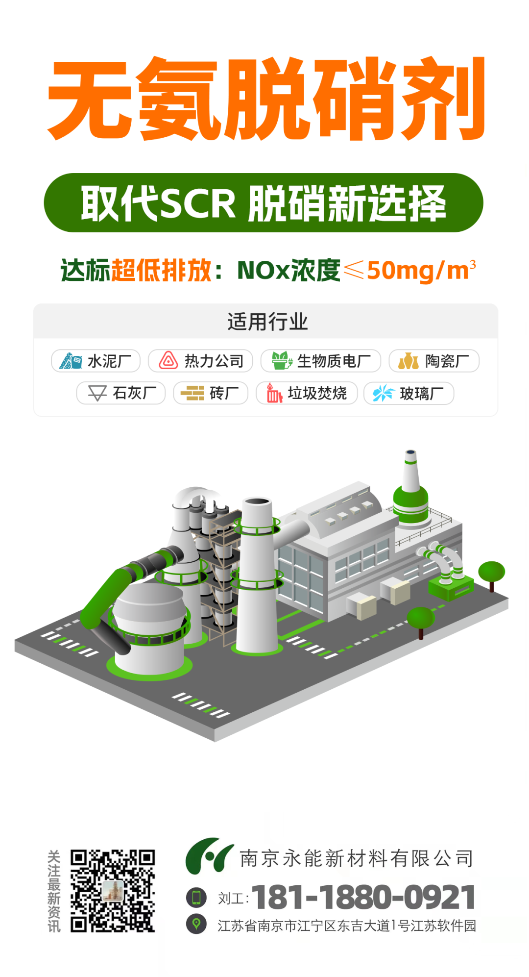 水泥生產廢氣的超低排放是大勢所趨,從目前脫硝技術手段落來看,單獨使用某一種脫硝技術不易達到超低排放和經濟性的統一。低氮燃燒技術雖然最經濟,可從根源上降低NOx生成,但降幅有限,無法實現末端超低排放,SNCR技術受反應效率所限,控制較低排放指標,需要大量過噴氨水,會造成大量氨逃逸,SCR技術可實現超低排放和低氨逃逸,催化劑用量與處理的NOx量成正比,進入SCR廢氣NOx濃度過高會帶來催化劑用量的上升和運行成本的增加。基于水泥企業(yè)脫硝的技術缺陷,南京永能新材料有限公司研發(fā)了一款液體無氨脫硝劑。該無氨脫硝劑可以在SNCR、SCR等脫硝系統后端進行輔助脫硝,無氨基,可以降低水泥企業(yè)氨水單耗和氨逃逸指標。