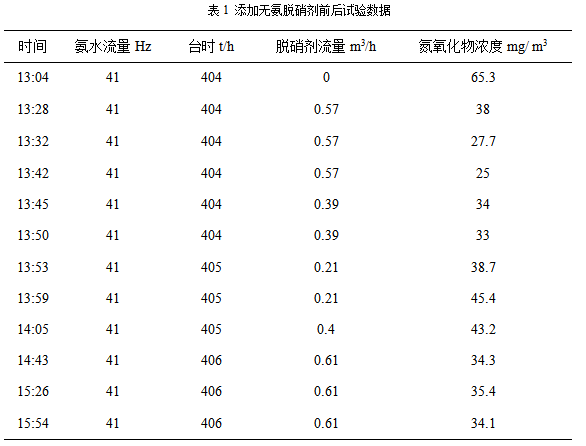 江蘇某水泥有限公司一條設計產能4500t/d水泥生產線,該公司水泥生產線脫硝采用SNCR,廠控氮氧化物排放指標為50mg/m³以內。本次試驗直接摻入南京永能公司研發(fā)的無氨脫硝劑,以快速確定產品脫硝效果,在氮氧化物排放穩(wěn)定后,加入稀釋后脫硝劑,觀測窯尾氮氧化物排放數值,氨水用量,臺時產量,評判脫硝劑的使用效果。