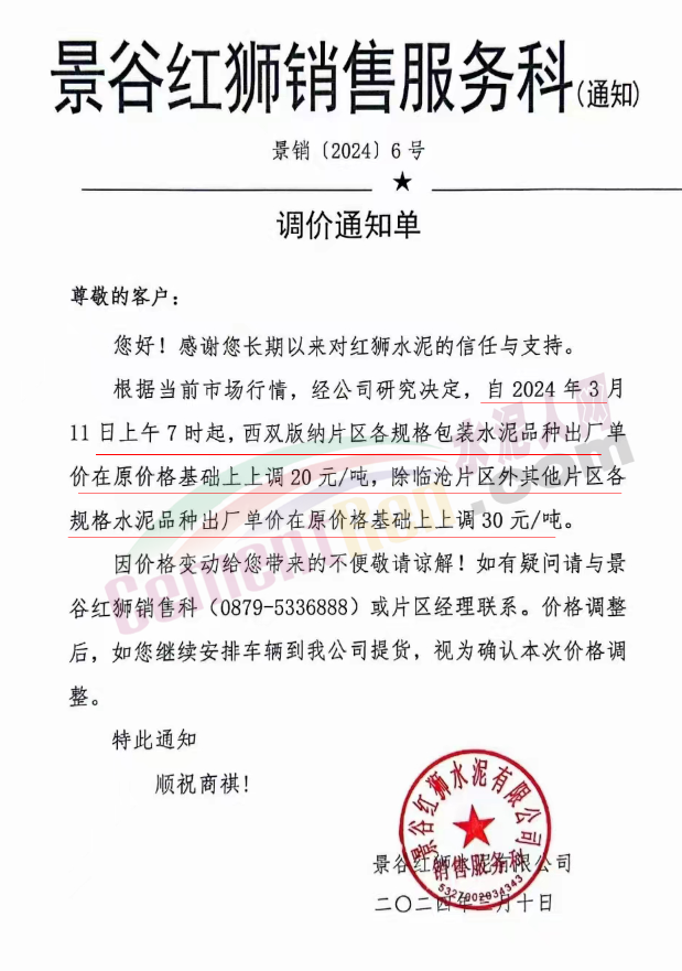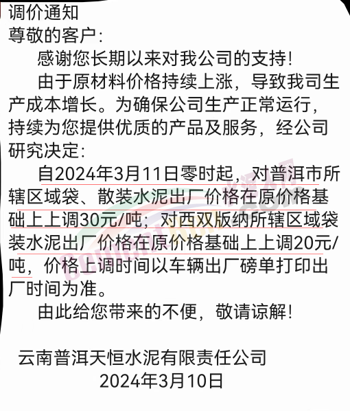 日前,云南景谷紅獅、普洱天恒等主要品牌企業(yè)通知上調(diào)水泥報價20-30元/噸。下游經(jīng)銷商表示,3月份是當(dāng)?shù)氐膫鹘y(tǒng)旺季,可是現(xiàn)在很多區(qū)域旺季不旺,漲價落實難度很大。