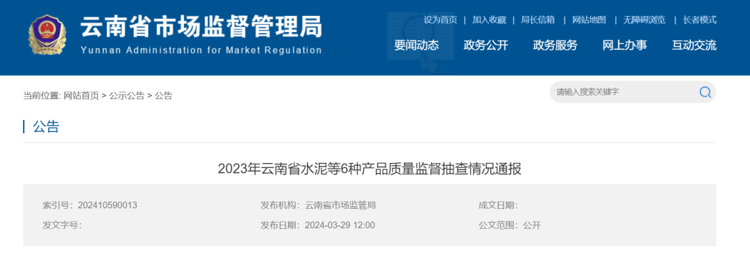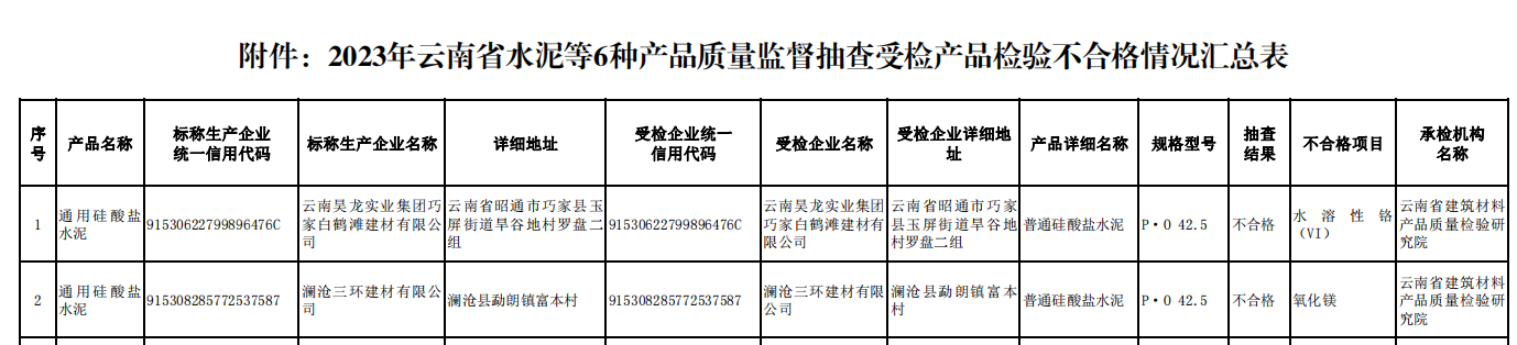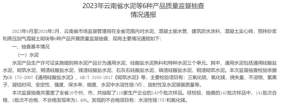 日前,云南省市場監(jiān)管局發(fā)布《2023年云南省水泥等6種產(chǎn)品質(zhì)量監(jiān)督抽查情況通報》稱,2023年8月至2024年2月,云南省市場監(jiān)督管理局在全省范圍內(nèi)對水泥、混凝土輸水管、建筑防水涂料、混凝土實心磚、預拌砂漿和蒸壓加氣混凝土砌塊等6種產(chǎn)品開展質(zhì)量監(jiān)督抽查。