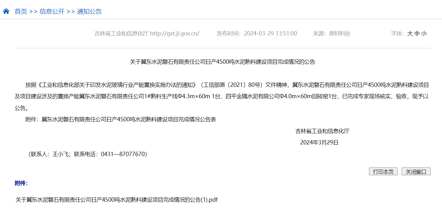 吉林亞泰水泥有限公司7500t/d生產(chǎn)線置換方案已公告,已備案。