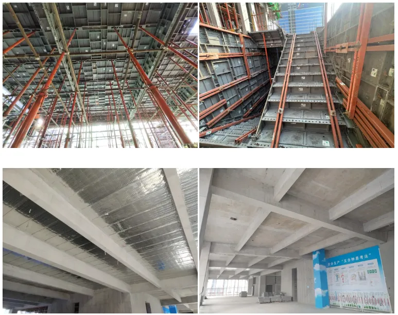 項目創(chuàng)新性鋁模快拆體系全樓整體性應用,即從負三層地下室到二十三層結構全部使用鋁模。一舉打破傳統(tǒng)標準層才用鋁模的模式。通過多次深化模擬測算,該應用,不僅極大節(jié)省工期,同時大大減少塔吊壓力,且混凝土成型質(zhì)量好,具有免修補打磨、不產(chǎn)生建筑垃圾、工完場清、節(jié)能減碳等優(yōu)點,助力碳中和。也為鋁模應用創(chuàng)造出新的模式,為建筑行業(yè)提出新的綠色智慧建造方案。
