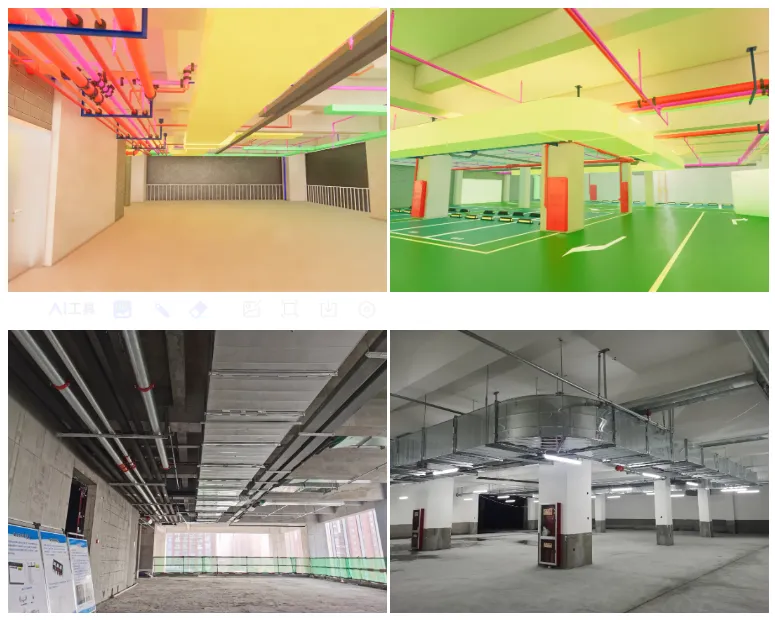 項目利用BIM 技術,將建筑、結構、機電模型集成后,開展管線碰撞檢查、吊頂標高控制等,通過碰撞檢查,形成綜合報告,進行設計優(yōu)化,出具綜合管線排布圖紙,遵照管道避讓原則,做到實體效果整齊美觀。