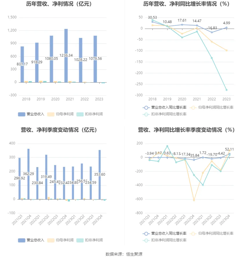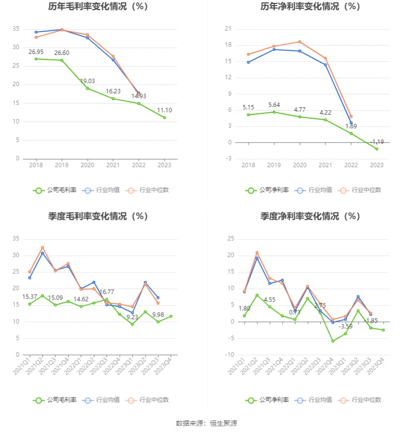 2023年,公司毛利率為11.10%,同比下降3.83個百分點;凈利率為-1.19%,較上年同期下降2.88個百分點。從單季度指標來看,2023年第四季度公司毛利率為11.68%,同比下降0.60個百分點,環(huán)比上升1.70個百分點;凈利率為-2.46%,較上年同期上升3.37個百分點,較上一季度下降0.61個百分點。