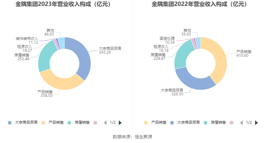 分產(chǎn)品來看,2023年公司主營業(yè)務中,大宗商品貿(mào)易收入392.26億元,同比增長20.14%,占營業(yè)收入的36.34%;產(chǎn)品銷售收入358.50億元,同比下降12.69%,占營業(yè)收入的33.21%;房屋銷售收入252.48億元,同比增長10.41%,占營業(yè)收入的23.39%。