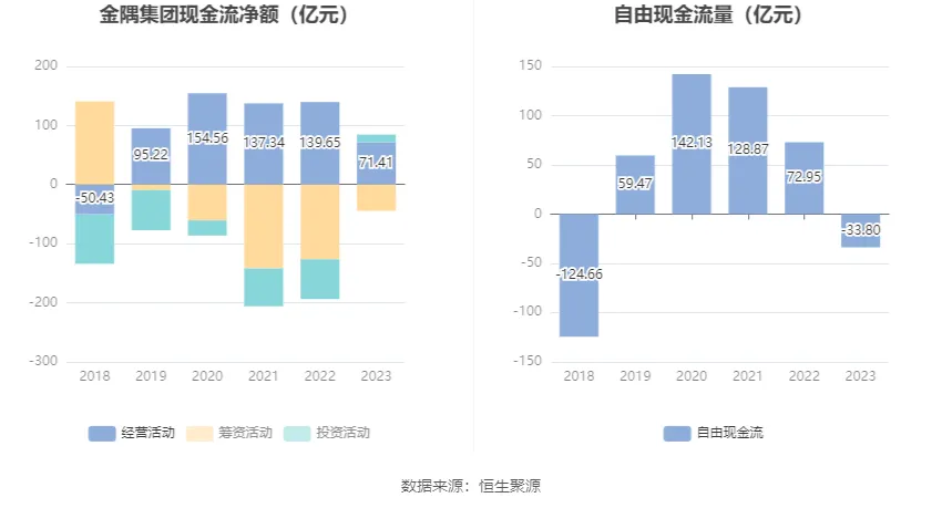 2023年,公司經(jīng)營活動現(xiàn)金流凈額為71.41億元,同比下降48.87%;籌資活動現(xiàn)金流凈額-44.63億元,同比增加82.02億元;投資活動現(xiàn)金流凈額13.24億元,上年同期為-67.32億元。