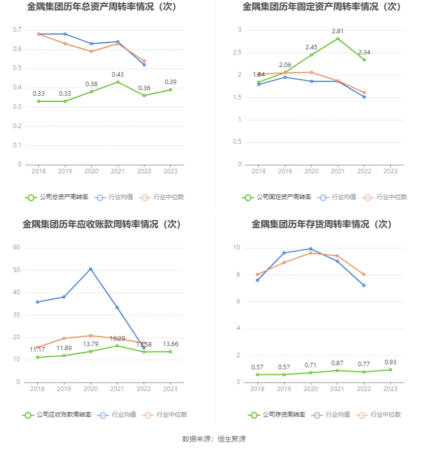 營運能力方面,2023年,公司公司總資產(chǎn)周轉率為0.39次,上年同期為0.36次(2022年行業(yè)平均值為0.52次,公司位居同行業(yè)15/16);公司應收賬款周轉率、存貨周轉率分別為13.66次、0.93次。