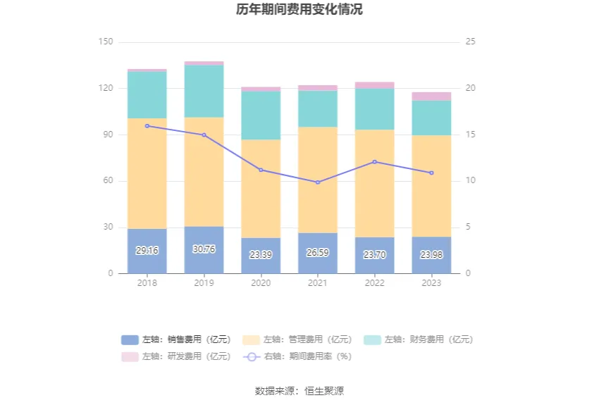 2023年,公司期間費用為117.69億元,較上年同期減少6.57億元;期間費用率為10.90%,較上年同期下降1.19個百分點。其中,銷售費用同比增長1.18%,管理費用同比下降5.64%,研發(fā)費用同比增長29.27%,財務費用同比下降15.35%。