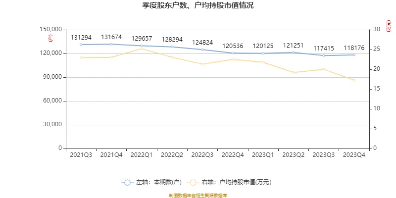 籌碼集中度方面,截至2023年末,公司股東總戶數(shù)為11.82萬戶,較三季度末增長了761戶,增幅0.65%;戶均持股市值由三季度末的20.01萬元下降至17.26萬元,降幅為13.74%。