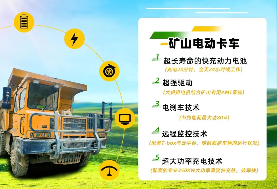 五、超大功率充電技術。配套的專業(yè)350KW大功率直流快充樁,確保礦車的運營效率。
