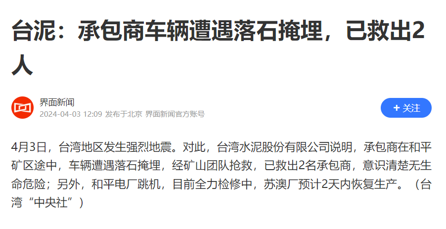 4月3日,臺灣地區(qū)發(fā)生強(qiáng)烈地震。對此,臺灣水泥股份有限公司說明,承包商在和平礦區(qū)途中,車輛遭遇落石掩埋,經(jīng)礦山團(tuán)隊(duì)搶救,已救出2名承包商,意識清楚無生命危險(xiǎn);另外,和平電廠跳機(jī),目前全力檢修中,蘇澳廠預(yù)計(jì)2天內(nèi)恢復(fù)生產(chǎn)。(臺灣“中央社”)