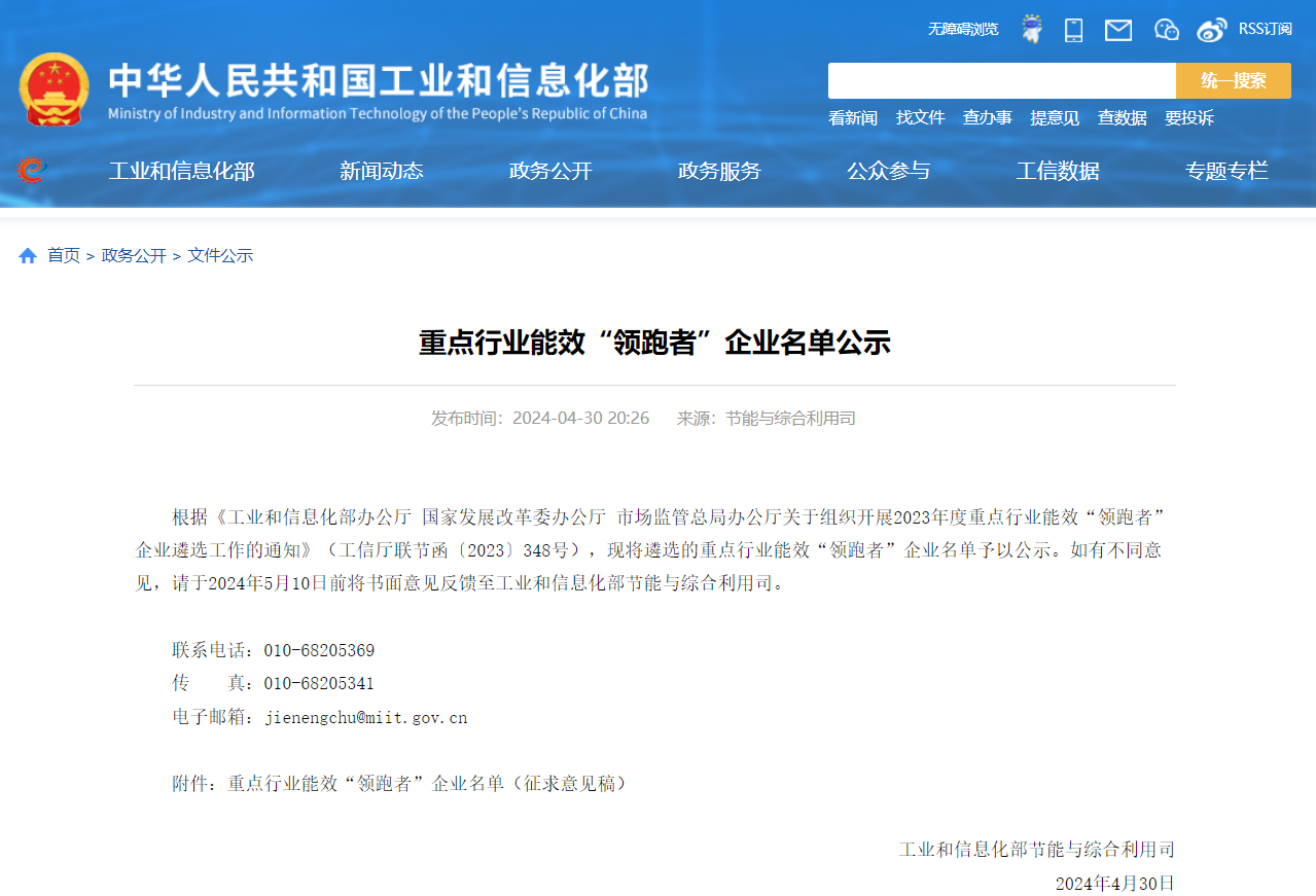 日前,工信部發(fā)布《重點(diǎn)行業(yè)能效“領(lǐng)跑者”企業(yè)名單公示》稱,根據(jù)《工業(yè)和信息化部辦公廳 國家發(fā)展改革委辦公廳 市場(chǎng)監(jiān)管總局辦公廳關(guān)于組織開展2023年度重點(diǎn)行業(yè)能效“領(lǐng)跑者”企業(yè)遴選工作的通知》(工信廳聯(lián)節(jié)函〔2023〕348號(hào)),現(xiàn)將遴選的重點(diǎn)行業(yè)能效“領(lǐng)跑者”企業(yè)名單予以公示。如有不同意見,請(qǐng)于2024年5月10日前將書面意見反饋至工業(yè)和信息化部節(jié)能與綜合利用司。