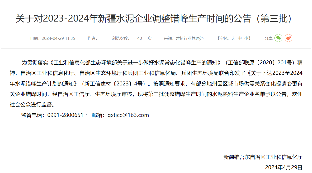 日前,新疆工信廳發(fā)布《關(guān)于對2023-2024年新疆水泥企業(yè)調(diào)整錯(cuò)峰生產(chǎn)時(shí)間的公告(第三批)》稱,為貫徹落實(shí)相關(guān)文件要求,有部分地州因區(qū)域市場供需關(guān)系變化提請變更有關(guān)企業(yè)錯(cuò)峰時(shí)間,經(jīng)自治區(qū)工信廳、生態(tài)環(huán)境廳審核,現(xiàn)將第三批調(diào)整錯(cuò)峰生產(chǎn)時(shí)間的水泥熟料生產(chǎn)企業(yè)名單予以公告,歡迎社會公眾進(jìn)行監(jiān)督。