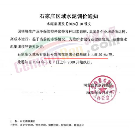日前河北石家莊地區(qū)主要品牌企業(yè)曲寨水泥通知,因錯峰生產(chǎn)及環(huán)保管控停窯等各種因素影響,集團(tuán)各企業(yè)均是低運轉(zhuǎn)、高成本運行,鑒于當(dāng)前的市場情況,為維護(hù)水泥行業(yè)健康發(fā)展,經(jīng)曲寨水泥集團(tuán)領(lǐng)導(dǎo)研究決定,自2024年5月7日上午9:00開始石家莊區(qū)域所有低標(biāo)號袋灰在原來價格基礎(chǔ)上上調(diào)20元/噸。