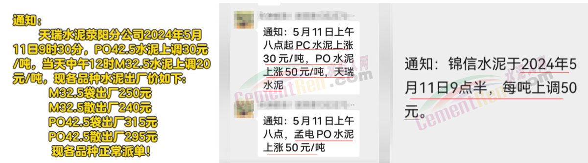 河南天瑞滎陽分公司通知,自5月11日9時30分起,P.O42.5水泥上調(diào)30元/噸,當(dāng)天中午M32.5水泥上調(diào)20元/噸。價格調(diào)整后M32.5包裝水泥出廠價250元/噸,P.O42.5散裝水泥出廠價295元/噸。南陽中聯(lián)水泥通知5月11日起水泥價格上調(diào)50元/噸。