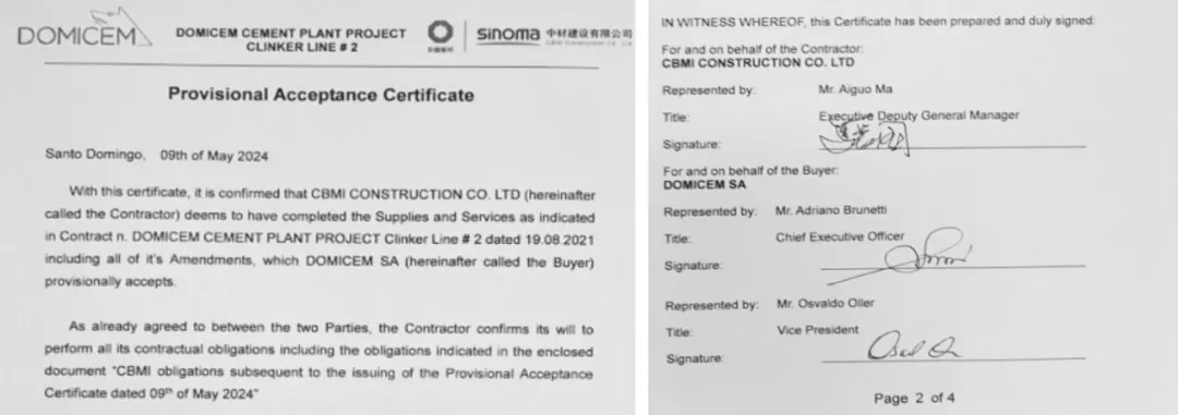 ▲ 多米尼加二期3500TPD熟料線項目獲得業(yè)主頒發(fā)的PAC證書