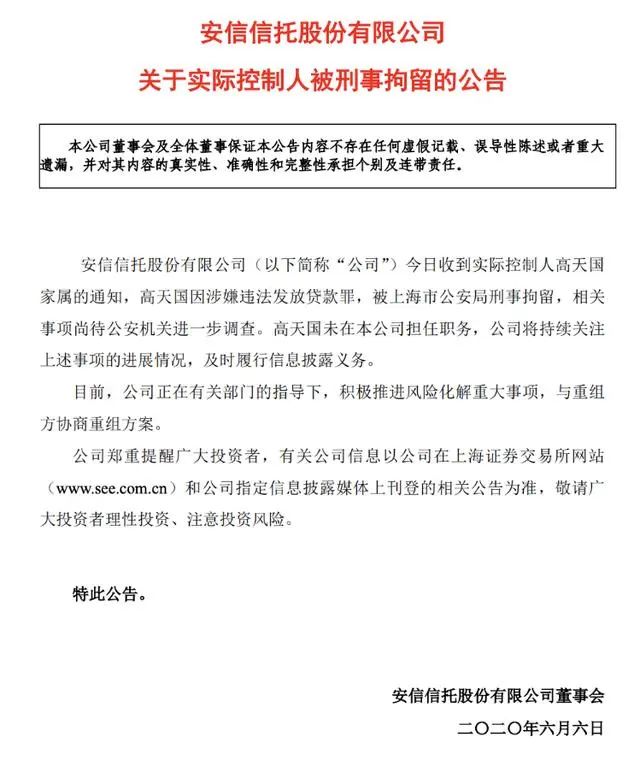 2019年,安信信托多個(gè)項(xiàng)目“爆雷”無(wú)法兌付,并被法院列入被執(zhí)行人,訴訟纏身。2020年6月,安信信托公告稱(chēng),收到實(shí)際控制人高天國(guó)家屬的通知,高天國(guó)因涉嫌違法發(fā)放貸款罪,被上海市公安局刑事拘留,這也成為三至喜來(lái)登酒店走向拍賣(mài)的開(kāi)端。