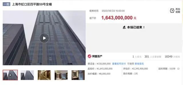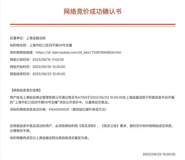 上海金融法院執(zhí)行立案后,于2023年9月23日公開(kāi)拍賣(mài)被執(zhí)行人抵押的全幢酒店即涉案酒店。阿里資產(chǎn)拍賣(mài)平臺(tái)顯示,此次拍賣(mài)共有18349人圍觀,1人報(bào)名。最終酒店以16.43億元的成交價(jià)被上海裕自商業(yè)管理有限公司拍下。