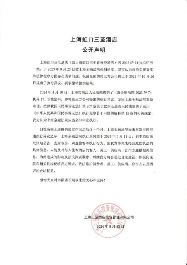 三至酒店微信公眾號(hào)顯示,2024年1月,公眾號(hào)名稱(chēng)由“上海虹口三至喜來(lái)登酒店”認(rèn)證為“上海虹口三至酒店”。5月17日,三至酒店發(fā)布聲明稱(chēng),認(rèn)為拍賣(mài)在事實(shí)法律程序方面存在諸多問(wèn)題,權(quán)益受損的第三方公司也提出了執(zhí)行異議,要求撤銷(xiāo)拍賣(mài)結(jié)果。