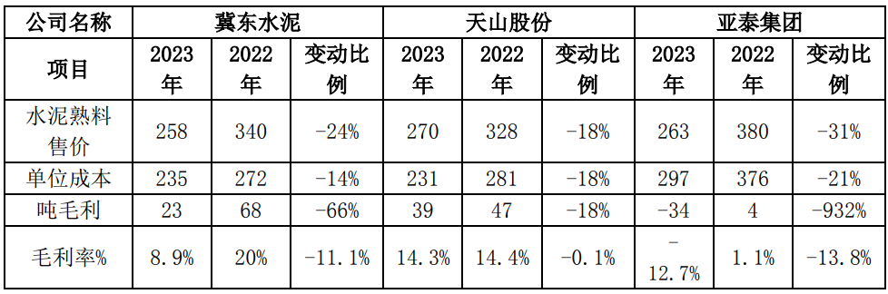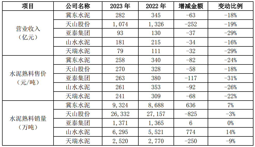 2023年受市場有效需求偏弱影響,產品價格大幅下降,公司水泥及熟料售價258元/噸,較同期下降82元/噸,同比降低24%;銷量9,324萬噸,較同期增加636萬噸,同比增幅7%。受供給過剩、有效需求不足兩端影響,公司主要生產線所在的華北地區(qū)、東北地區(qū)水泥價格呈現(xiàn)總體下降態(tài)勢,即使在二季度旺季,亦未出現(xiàn)明顯反彈。華北、東北地區(qū)水泥價格下調幅度均超過100元/噸,跌幅分別為20%和21.8%。水泥及熟料售價大幅降低導致公司營業(yè)收入同比下降18.26%,與同行業(yè)可比公司披露的數(shù)據(jù)對比,公司營業(yè)收入降幅符合行業(yè)趨勢。