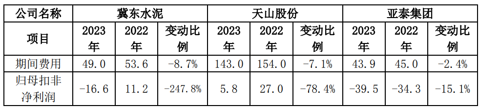 2023年扣非后歸母凈利潤-16.56億元,同比減少27.75億元,降幅為247.84%;利潤總額-19.01億元,同比減少37.2億元,降幅為204.35%,其中:水泥及熟料售價同比降低82元/噸,影響利潤減少76.5億元;單位綜合成本同比下降37元/噸,影響利潤增加34.5億元;銷量同比增加636萬噸,影響利潤增加4.3億元;期間費用48.96億元,較同期減少4.64億元,影響利潤增加4.64億元。