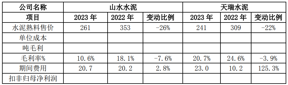 注:山水水泥、天瑞水泥2023年暫未披露水泥及熟料單位成本、噸毛利及扣非歸母凈利潤相關信息。
